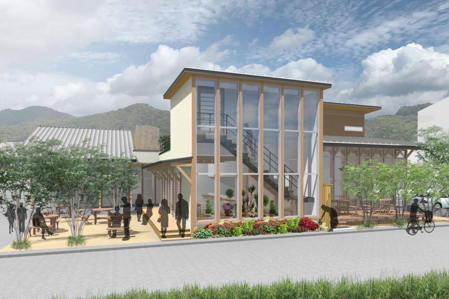 地域の憩いの場である、大貫診療所。建設中サウナ(2階)1階部分に、蕎麦屋、珈琲屋、花屋、ワークショップスペースからなる地域複合施設を作り、延岡の活性化に繋げ町の賑わいを生み出します。