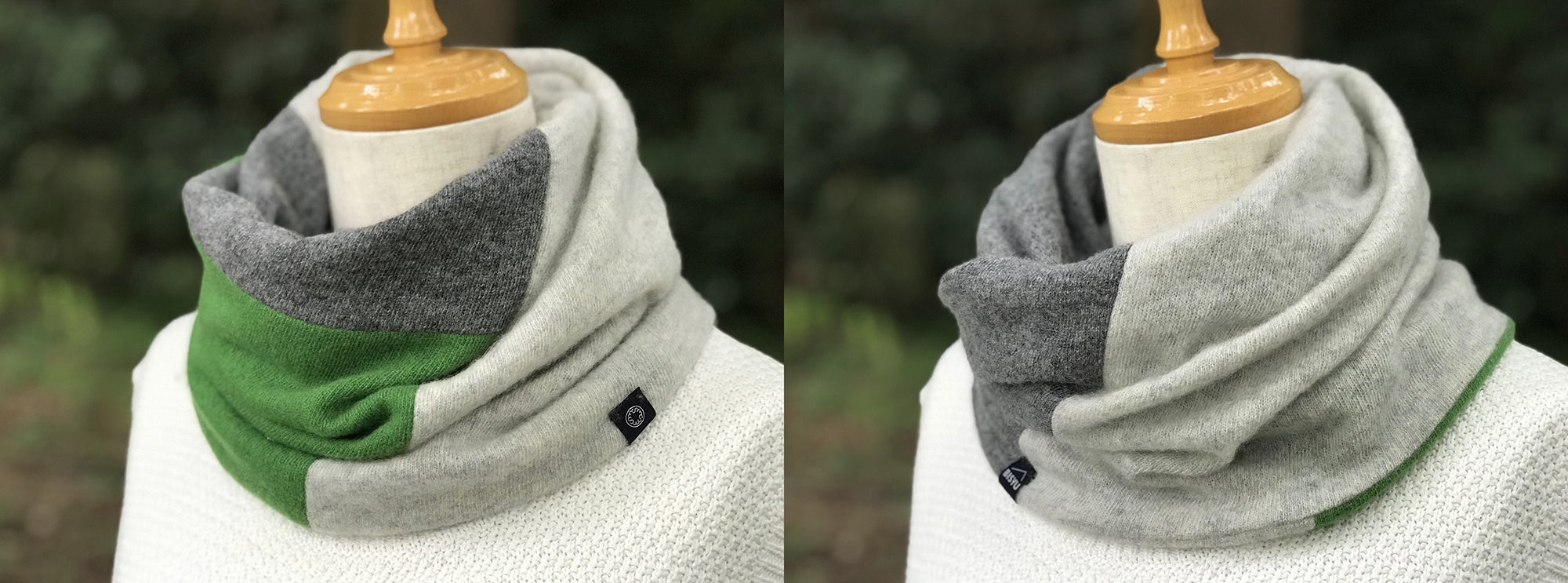 design:素材を積み木のように接ぎ合わせたスヌード。表面は3つのお色がバランスよく組み合わされとっても華やかに、裏面は2つのお色で抑えめの配色になる様デザインされています。