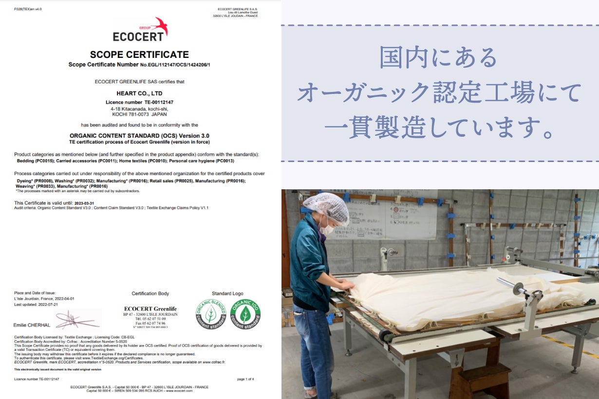 綿花の収穫から加工、製造、流通のすべての過程において、オーガニック基準に沿っているかを継続的に確認し、いつどこで採れ、どこで加工されたのかがわかる仕組みになっています。
