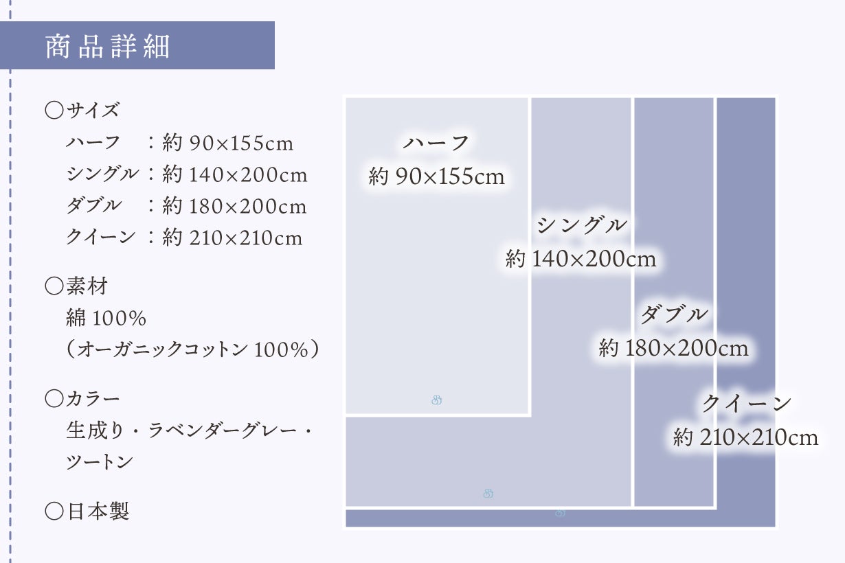 レギュラーサイズはもちろん、お子様用やひざ掛けにぴったりなハーフサイズ、ご家族でゆったり使っていただけるダブルサイズやクイーンサイズもご用意しております。