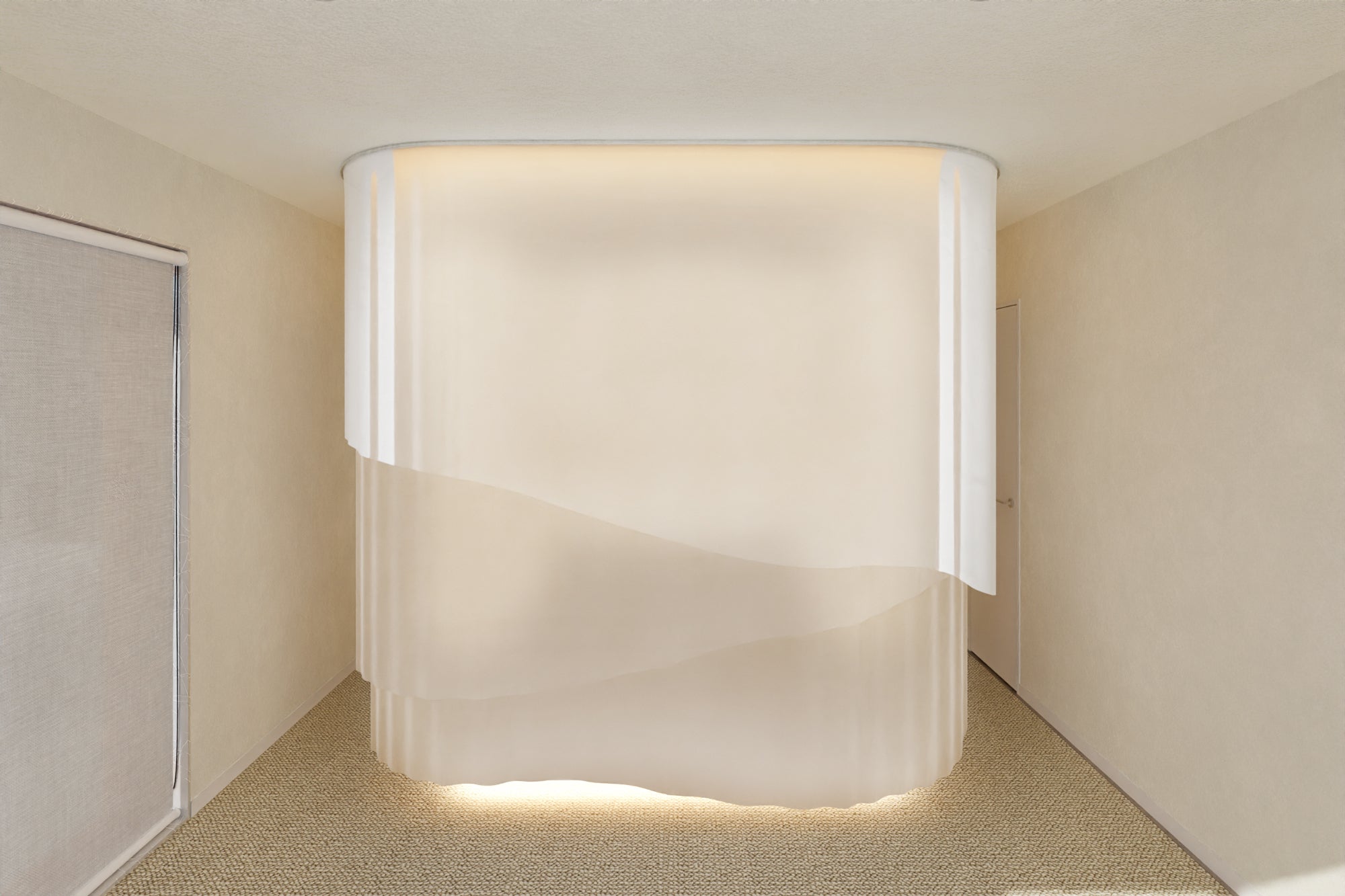 繭の内部にいるような内装。ベッドルームはシルクカーテンに囲まれています。