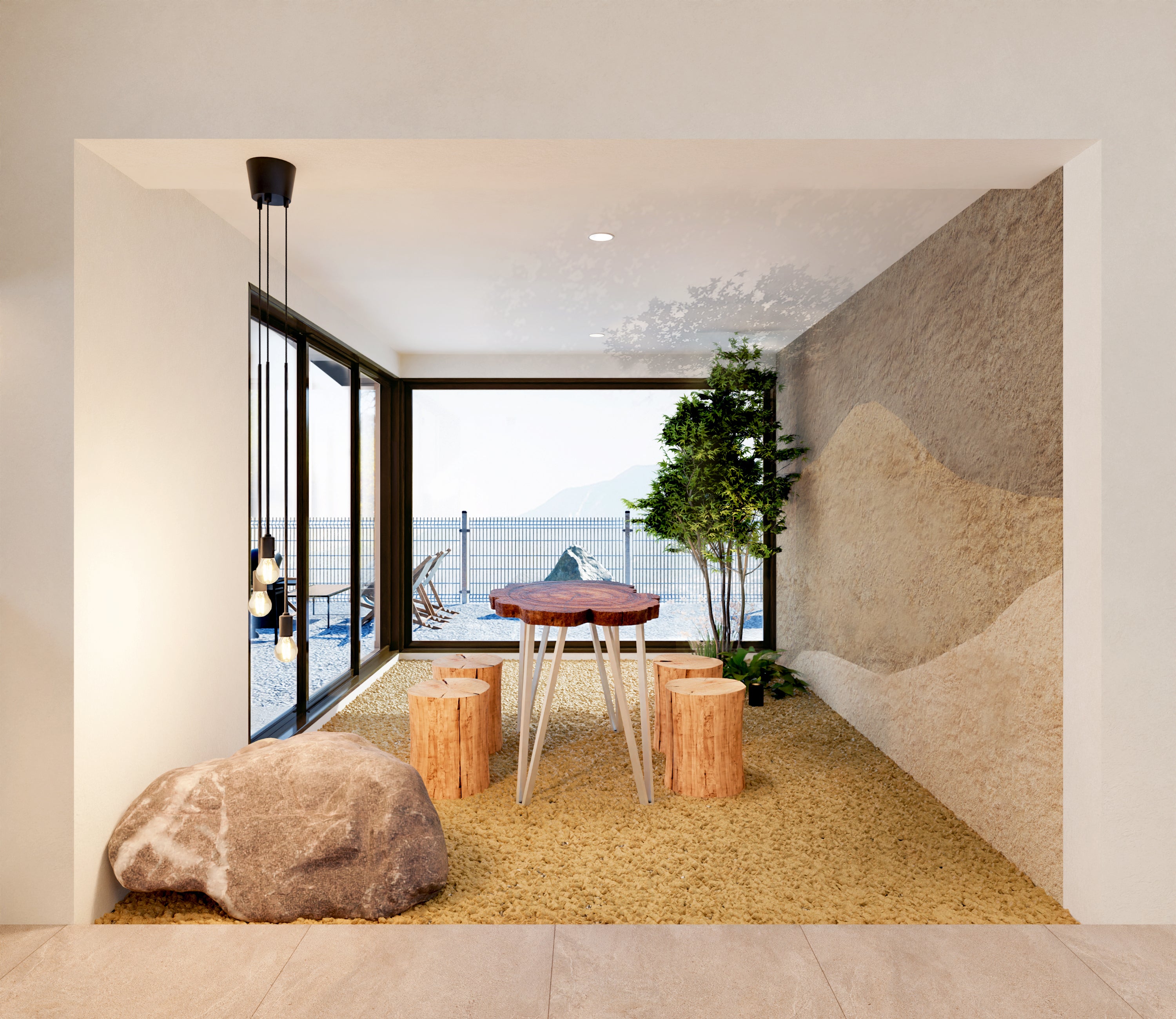 荒船の黒泥色の岩、下仁田ジオパークの地層を彷彿とさせる壁面、鏑材から切り出した丸太チェア、荒船の植生を取り入れた観葉植物。荒船の自然を凝縮したようなサンルームを体験することができます。