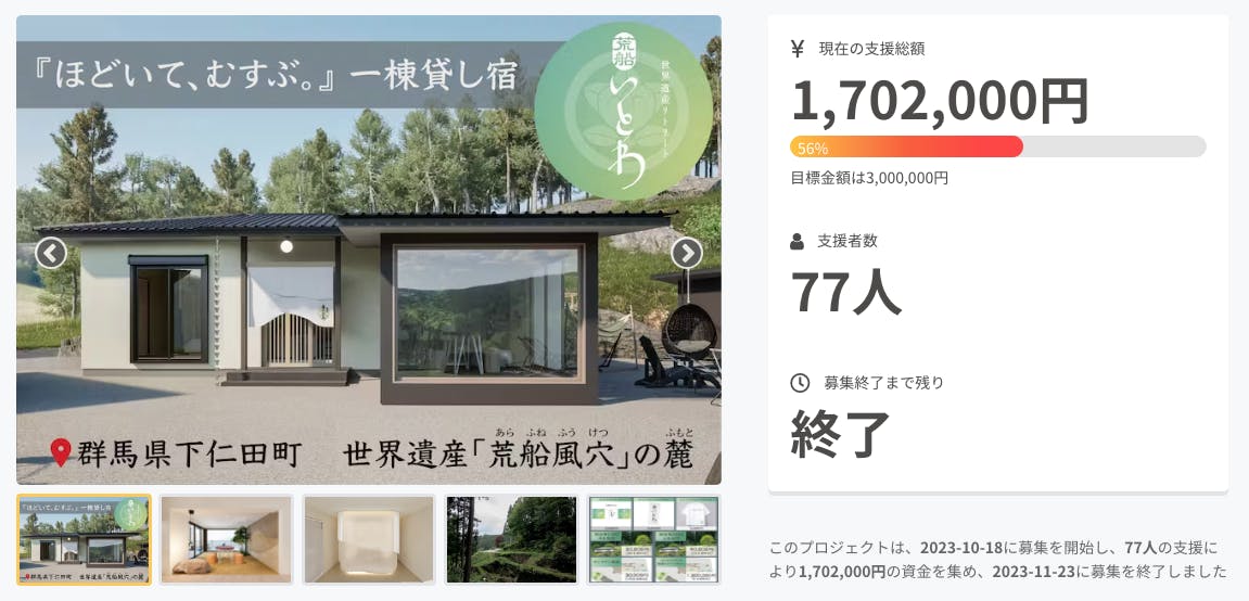 2023/11/26 23:57皆さん、こんばんは!11/23にてクラウドファンディングが終了しました。シェア拡散ご支援いただいた皆様、本当にありがとうございました。達成率56%、1,702,000円のご支援をいただきました。目標達成には至りませんでしたが、77名(縁起いい!)の方にご支援いただいたことに感謝です。年始から開業予定、これからが本当のスタートです。この施設に共感いただける方にとって良い体験を提供できるよう、これからも磨きかけて行きたいと思います!年内にリターンの準備を進めまして、随時ご案内させていただきます。この度はありがとうございました!荒船いとわ 代表 山崎智博 もっと見る明日で終了です!現在の現場進捗レポートです!!