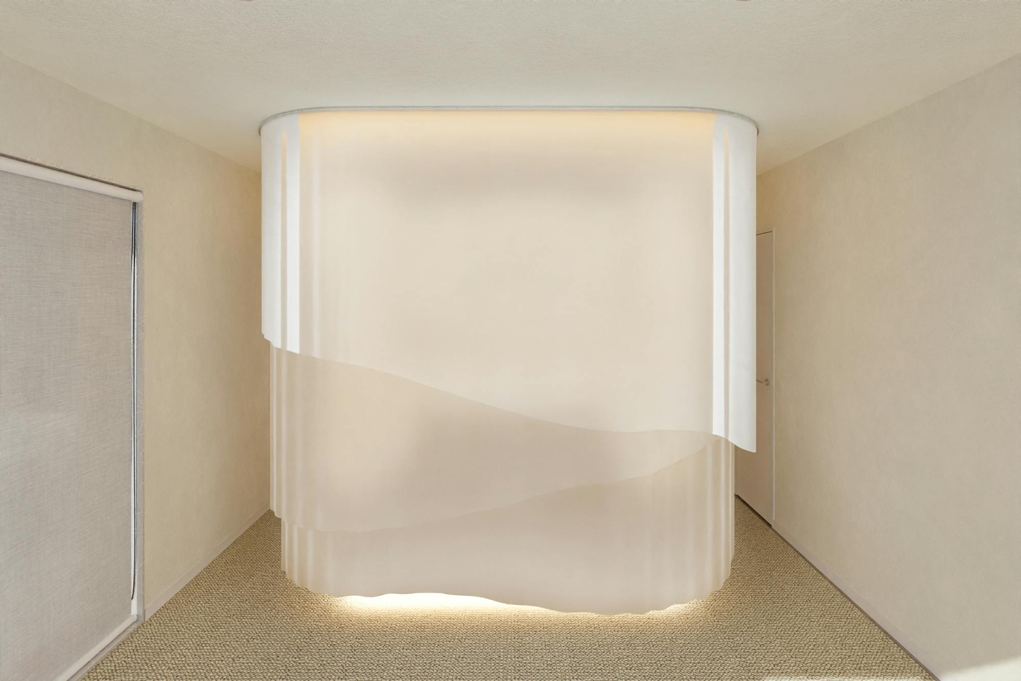 繭の内部にいるような内装。ベッドルームはシルクカーテンに囲まれています。