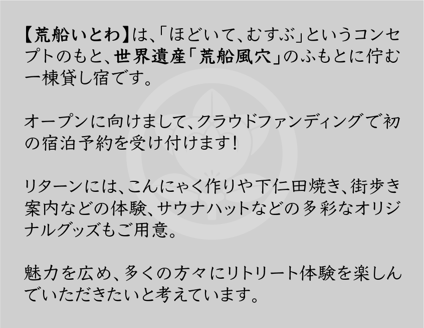 2024/03/07 02:31こんにちは!世界遺産リトリート荒船いとわ、クラウドファンディングにご支援いただきましてありがとうございました。今日はリターンのお届け完了しましたのでご報告です。宿泊券は1/28より予約受付開始致しました。支援者様へは予約方法等を個別にメッセージしております。既に何名様かは日程確定しております。グッズ関連は2月頭より順次発送いたしまして2月中旬には完了しております。全てチェックしておりますが万が一届いてない方がいらっしゃいましたらメッセージにてご連絡ください。グッズの一部(サウナマット、サウナハット)館銘板の設置も2月下旬に完了しました。サウナ小屋に設置させていただきました!館銘板そして来たる3/15にグランドオープン致します!一粒万倍日、天赦日、寅の日が重なったサイコー(3・1・5ー)にめでたい日です。(さぁ、いこう!でもOKですw)4/1からは荒船風穴も開業です。これからが荒船いとわの本当のスタートです。皆様に訪れて泊まっていただける施設を目指しますので引き続き応援よろしくお願いします! もっと見る