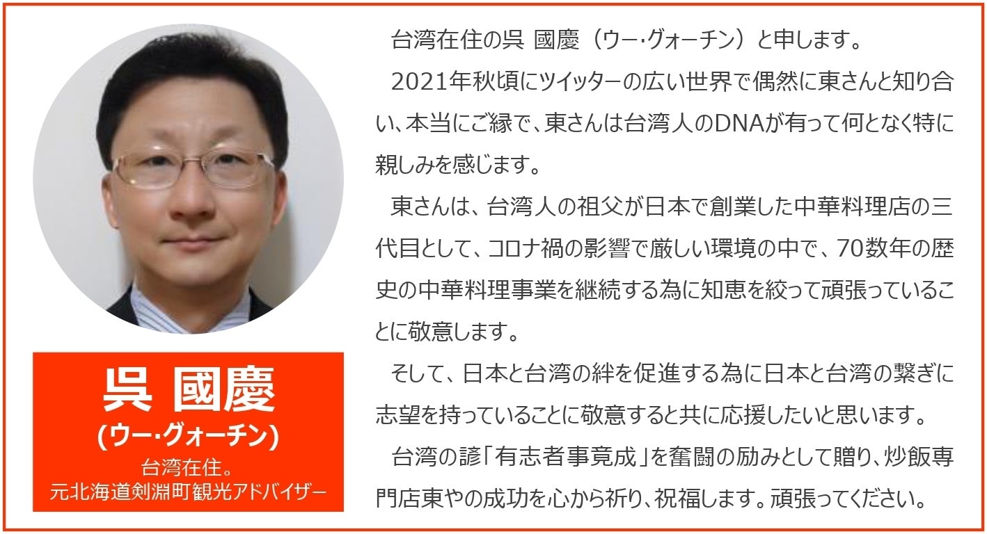 台湾出身の祖父が創めた食堂「東屋」を父が継ぎ、私が継ぎ、3代目として頑張って参りましたが、昨年末、共にお店を切り盛りしていた母の体調悪化でやむなく閉店しました。ですが、今年6月12日に炒飯専門店として復活いたしました!
