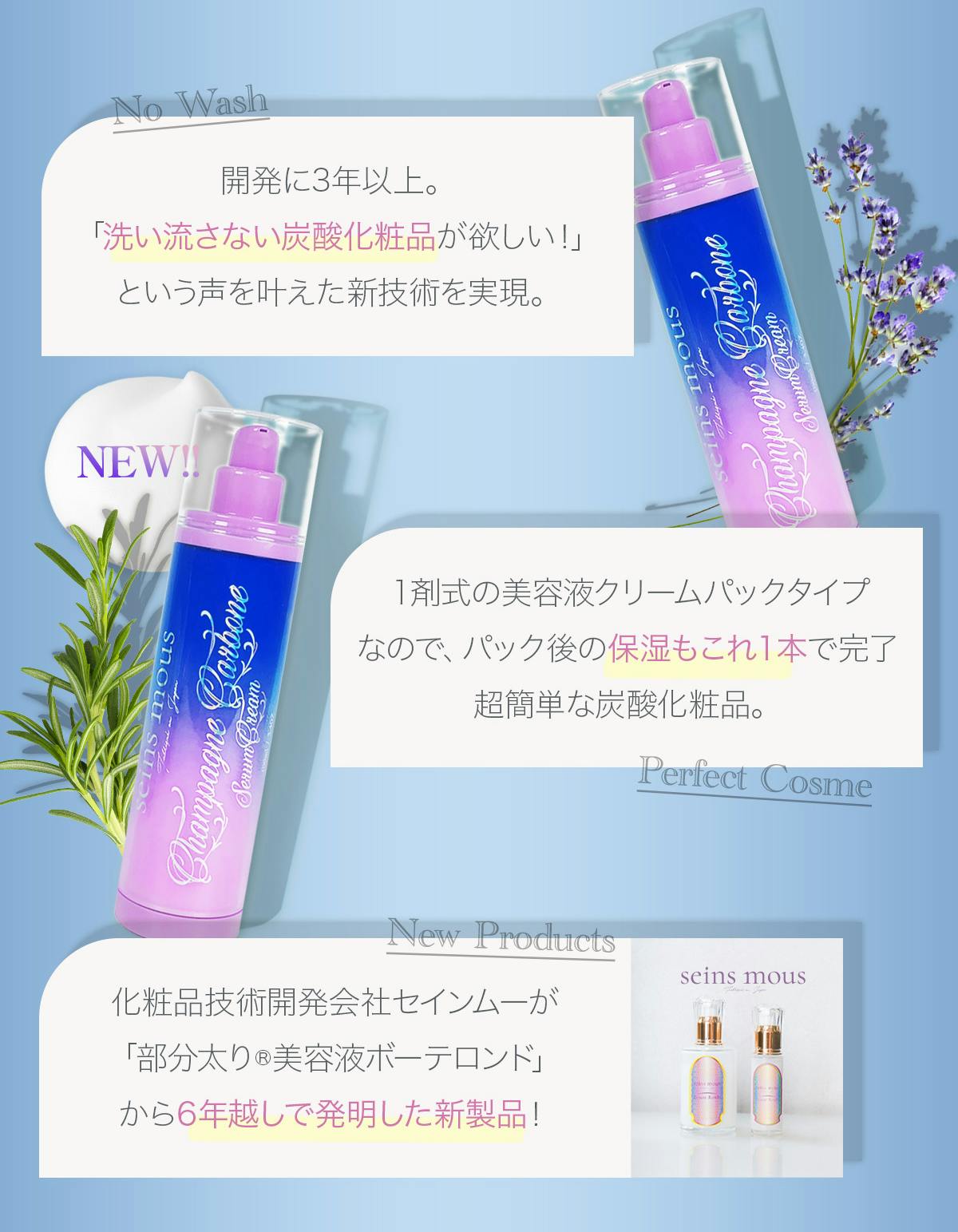 この有機酸と炭酸セラムクリームパック「シャンパーニュ・カーボン」が反応して、炭酸を自己発泡するために、2剤式のような混ぜ合わせる手間がありません。