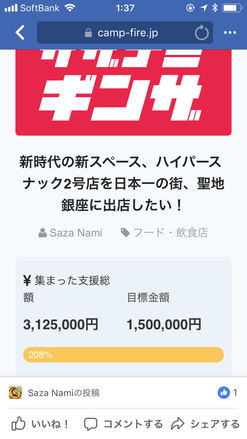 2018/06/16 08:50ありがとうございました! ハイパースナックサザナミ銀座店クラウドファンディング無事終えました。 3,125,000円ものご支援が集まりました。 多くのパトロンの皆さまには心より感謝しております。 しかし、これからがスタートであります。 身を引き締め良い店づくりが出来るよう頑張ってやっていきたいと思っております! もっと見る