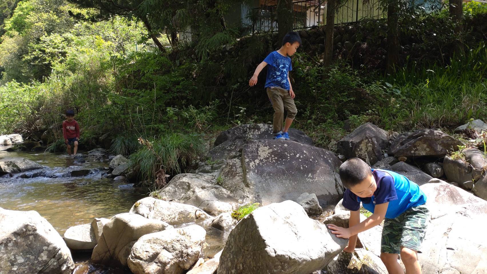 川では、石を並べて水を堰き止める創作をしたり、おもちゃを流したりして遊びます。