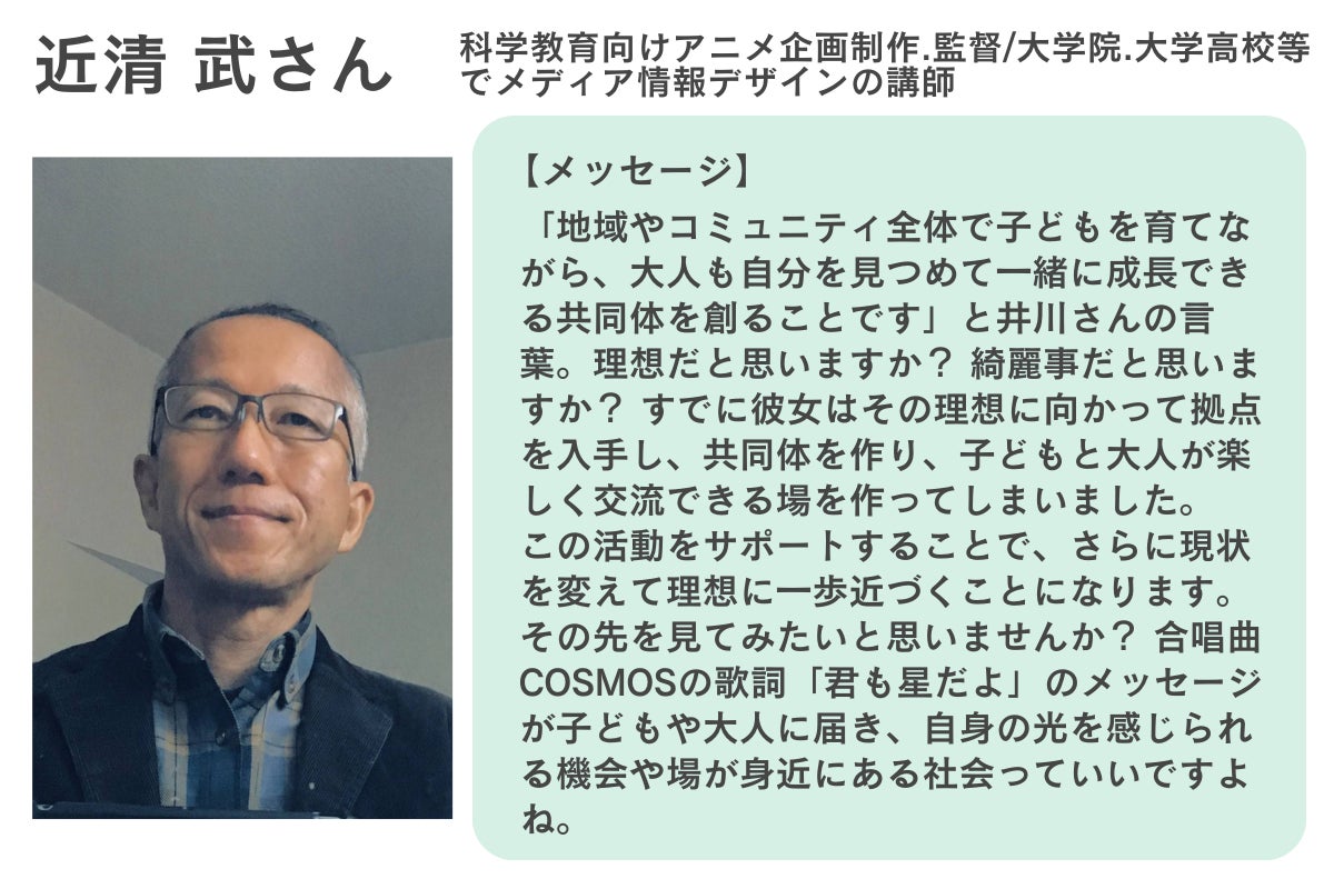 そして、本当の意味で地域が活性化するには、そこで暮らす人、大人も子どももすべての人がいきいきと、自分らしく、自由に生きられることが最も大切だと感じています。そうした「新しい価値観」を体現できるコミュニティ・共同体を創ることが、私の今の目標です!