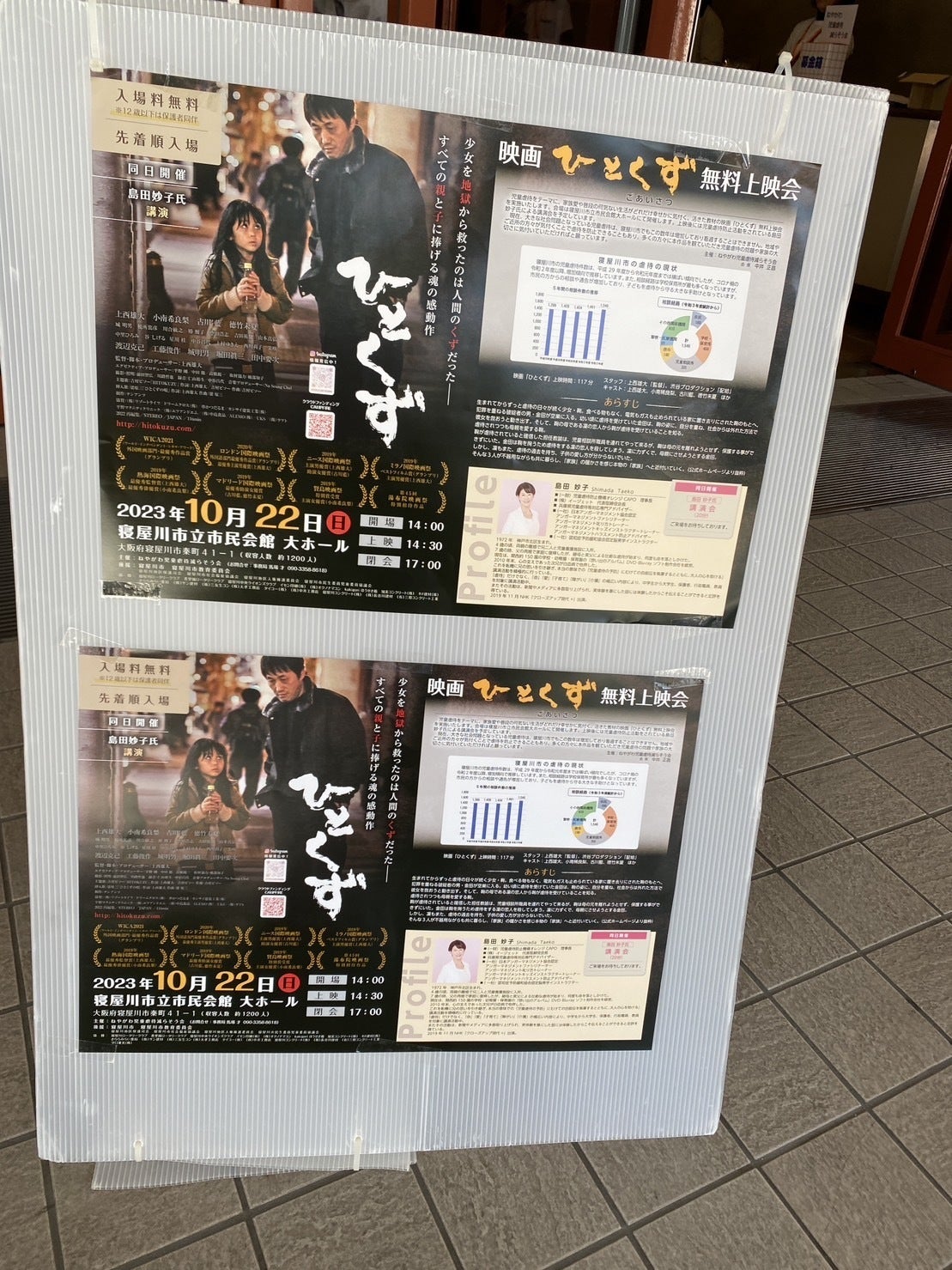 2023/10/23 15:3010月22日(日)秋晴れの日曜日「ひとくず」上映会を寝屋川市民会館大ホールで開催いたしました。14時開場予定でしたが、時間前からお並びいただき、急遽早めに入場となりました。入場者は約500名…たくさんの方にご来場いただきありがとうございました!!約2時間の上映後は島田妙子先生の講演会も行われ、サイン会・書籍の販売当日の詳細やアンケートの分析など実施報告書につきましては、集計後、お知らせいたします。また、リターンの発送につきましても進めてまいります。まずは無事開催できたお知らせとご支援いただきましたみなさまにお礼申し上げます。ありがとうございました! もっと見る