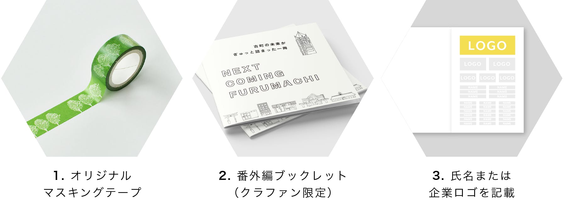 ¥3,000〜5,000コース : 初版本を買ってくれる個人の方に向けています。先行予約の特典でオリジナルマスキングテープや番外編ブックレット、12月開催予定の初版本お渡し会へご招待します。