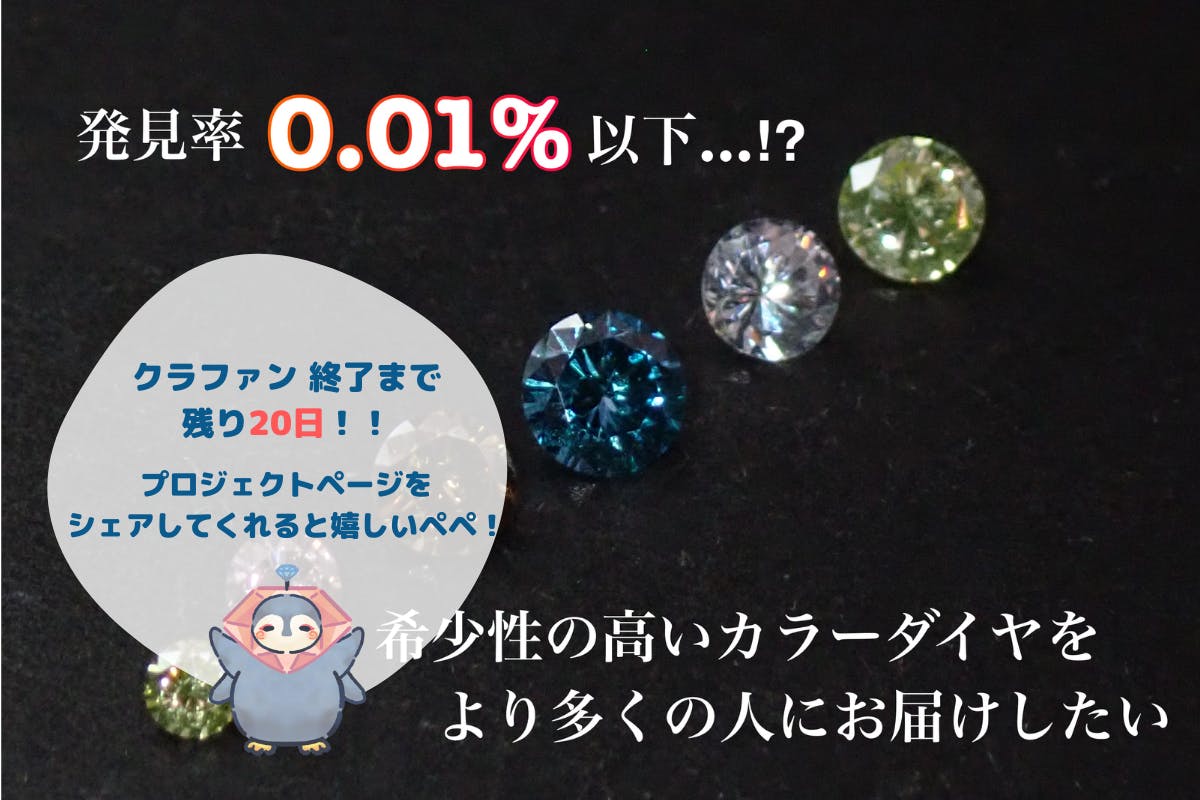 天然のカラーダイヤが産出されるのは僅か0.01%程度で、とても希少性が高いのです!無色透明なダイヤモンドをイメージする方も多いと思いますが、イエロー及びブラウン、またはブルー、グリーン、ピンク、レッドなどと『ない色はない』と言われているほど様々な色が存在します。そんな魅力溢れるカラーダイヤモンド を是非、皆さんに気軽に手に取って、見て、楽しんでほしいと思い今回プロジェクトをやろうと考えました!