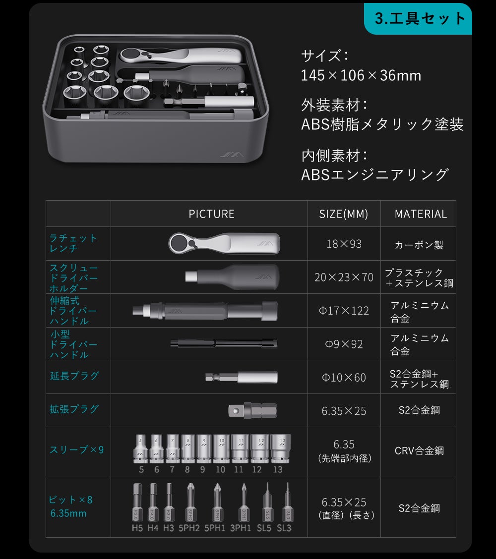 普通のドライバーセットって、ビットやソケット等のツールが沢山付属していて便利ですが、収納する場所が決まっておらず、整理整頓できずにぐちゃぐちゃになって使いにくかったりしませんか?"JIMIBOX 3.0"なら、全てのツールの保管先が決まっており、効率よくコンパクトに収納できるため、快適に作業できます!