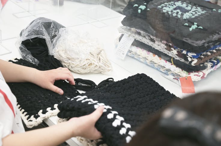 靴下を製造する工程でできるハギレを「作り手の感性や個性」でひとつひとつ丁寧に編み上げて作られています。