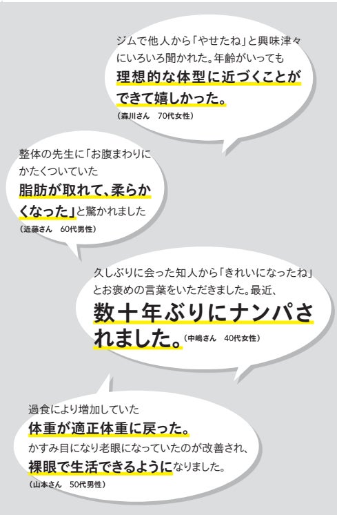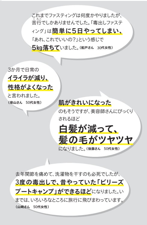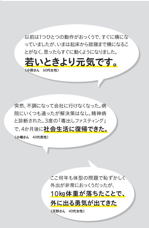 1,800人以上の方がこの本に書かれている事を実践されており、「体が軽くなった」「肌が綺麗になった」「気分が晴れやかになった」など嬉しい感想がたくさん届いていますので、その一部をご紹介させていただきます。