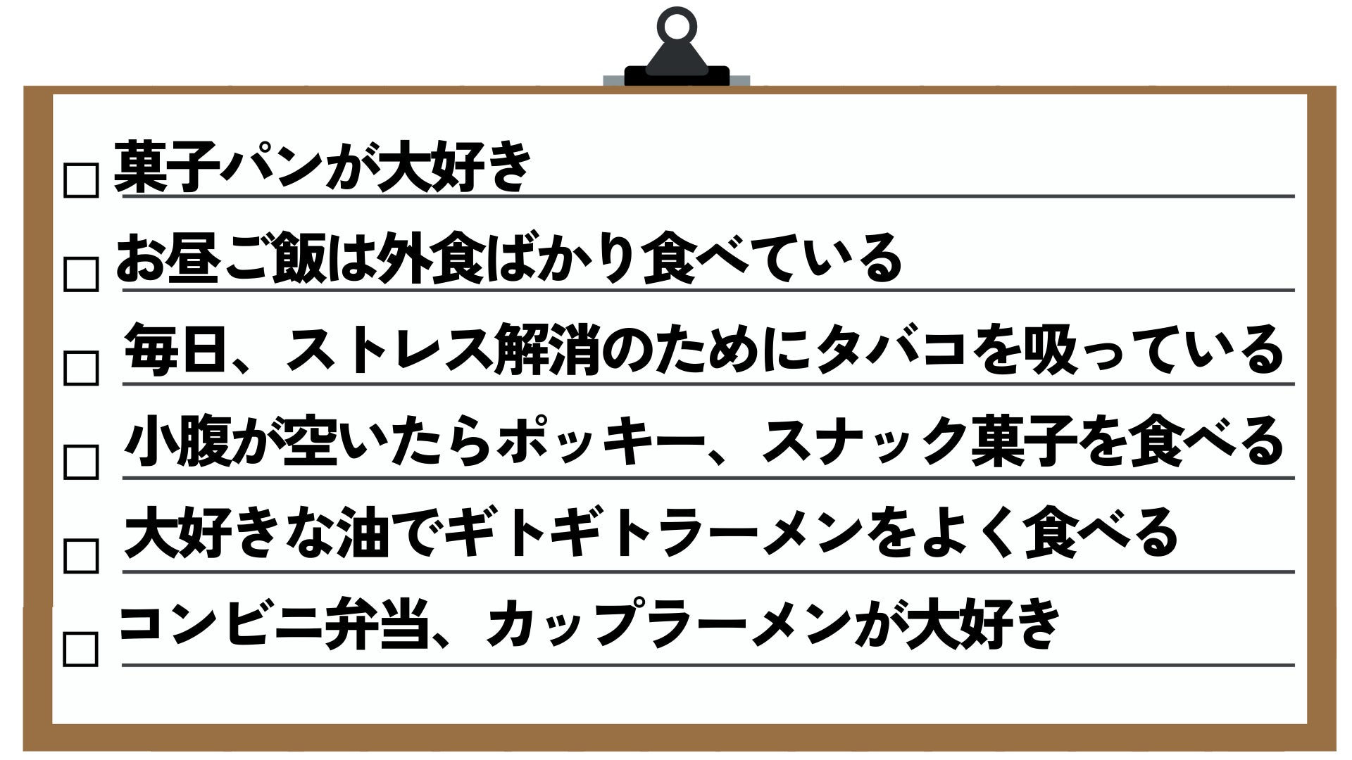 あなたや、お子様、その他のご家族ごとに、人を分けてチェックして見てください。実はネタバラシではないですが、今から約20年前、大学院生だった私はこの全ての項目に当てはまる生活をしていました。