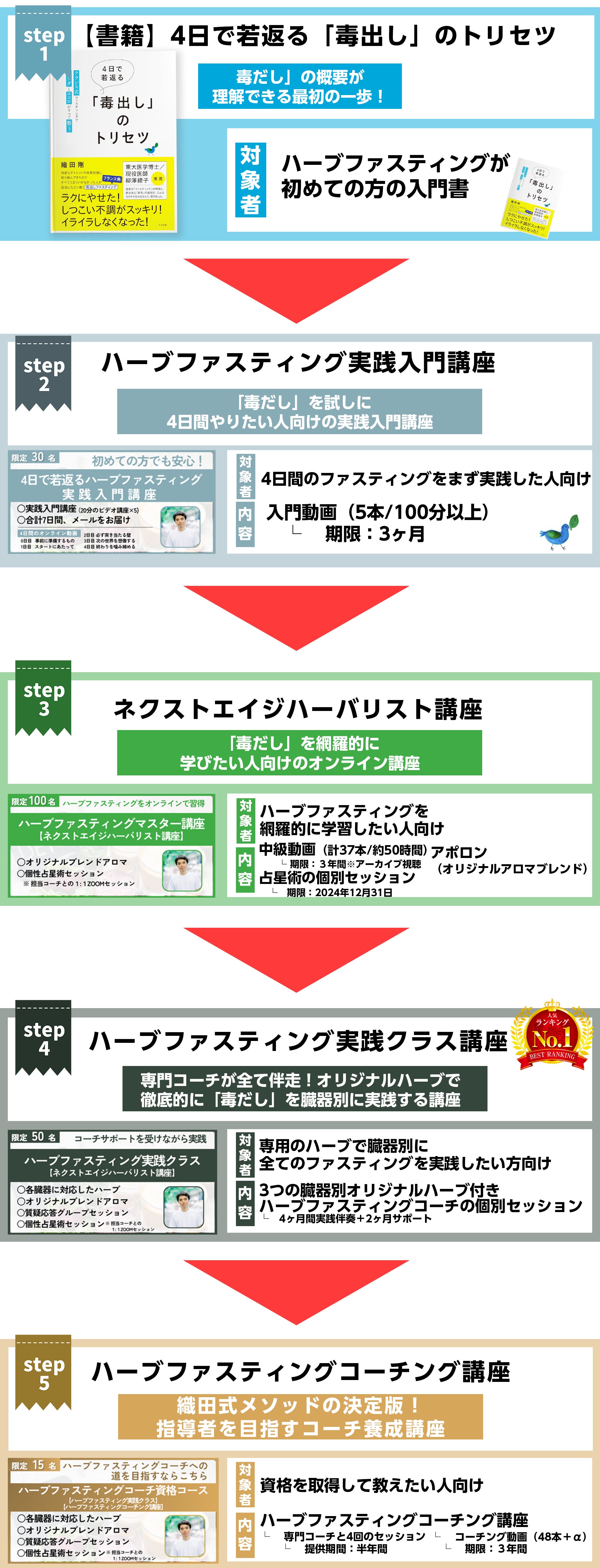 ハーブファスティングに興味はあるけれど、どのコースから始めたらいいのかわからないという方のために、ステップ別のガイドを用意しました。ハーブファスティングにはさまざまなコースがあり、それぞれの特徴をわかりやすく紹介しています。自分に合ったコースを見つけ、迷わずスタートしてください。
