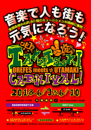この度わたしたちは、来たる6月9・10日の二日間、大阪府高槻市にて、『俺ふぇす』と『唄まき』というそれぞれ独立した音楽イベントをコラボさせた『TAKATSUKI CARNIVAL!俺ふぇすmeets唄まき♪』を開催することに致しました。