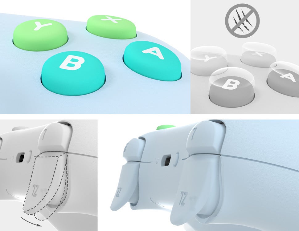 A・B・X・Yボタンの各表面は傷がつきにくく、また、ZL・ZRボタンは少しカーブしているので、ボタンを押すとき滑らないようにしました。