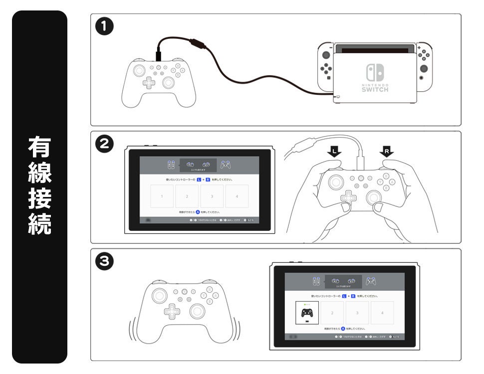 ※有線接続をする場合は、Switch本体の設定画面「Proコントローラーの有線通信」を「ON」に設定してからご使用ください。