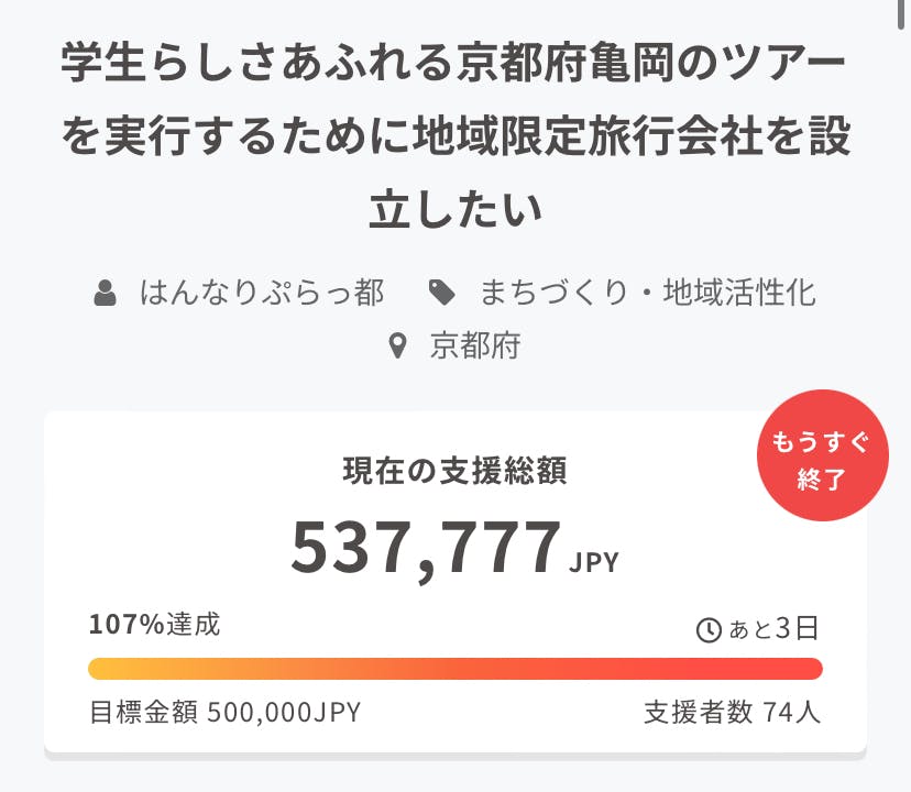 私達自身も、旅行者と地域住民を繋ぐツアーを考えていることから、より多くの人の目に行き届くクラウドファンディングを用いて自分達が考えたツアーの魅力を発信し、ツアーを実行するための資金集めと私達の想いに賛同してくださる支援者の方を探そうと考えました。