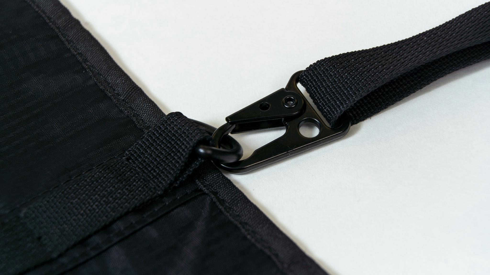 お手持ちのカラビナを2個取り付ければ、バックパックのチェスト位置でぶら下げることも可能。