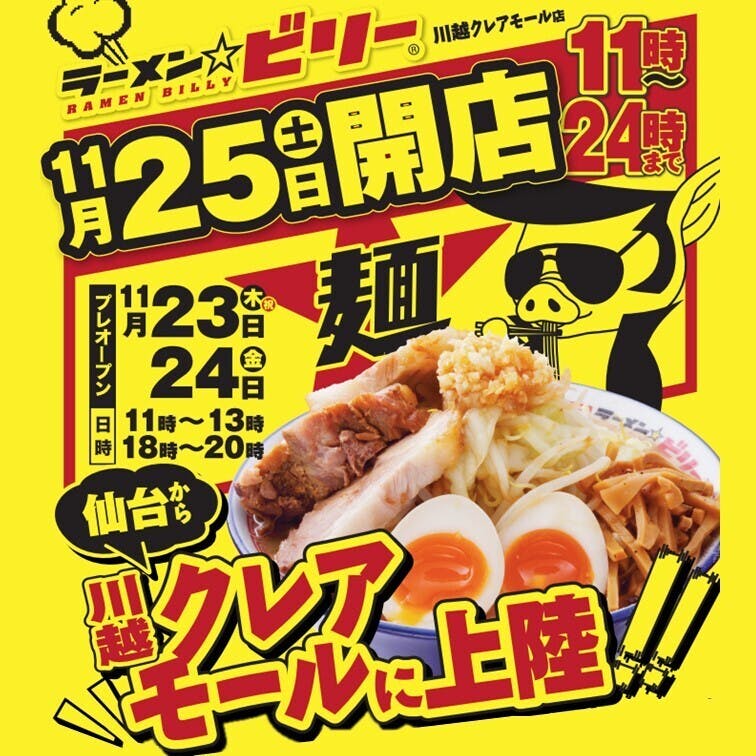 2023/11/02 18:50【告知】BIGなお知らせがあります!この度、ラーメン☆ビリーの関東進出が決まりました!!11月25日(土)グランドオープン!仙台から埼玉県の『川越クレアモール』に初上陸!関東にお住まいの方はぜひ、足を運んでみてください。ビリーくんのつぶやきはこちら↓https://twitter.com/Ramen_Billy今日からカウントダウンしていくから、一緒に盛り上げてくれたらうれしいぜ もっと見る