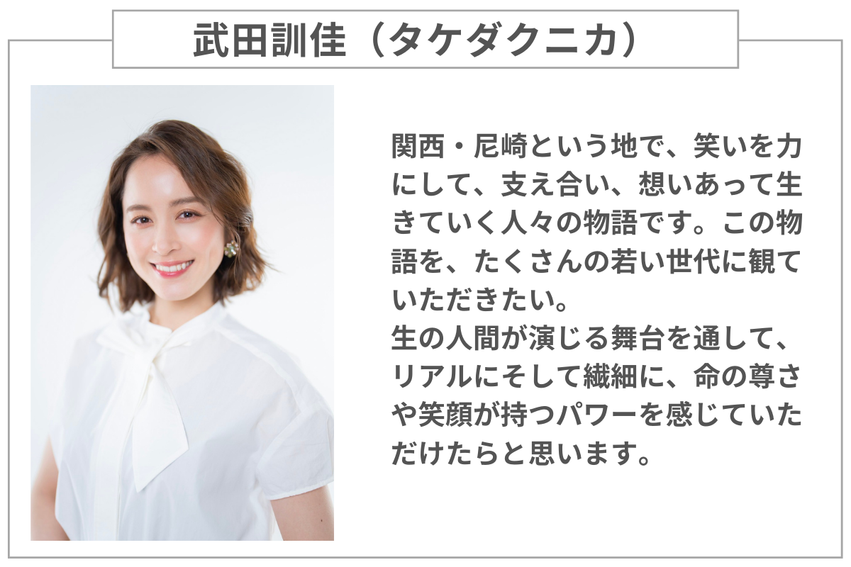 物語としては、尼崎という町を舞台に、余命半年のオカンを「笑いのチカラ」で救う為に奔走する高校生のひたむきな姿を描く人情にあふれる内容です。これを毎年繰り返して公演していくことで尼崎市⺠にも愛される作品として、将来的には、出演者、スタッフなども尼崎の人たちが参加できる”⽂化祭”にしたいと思っています。