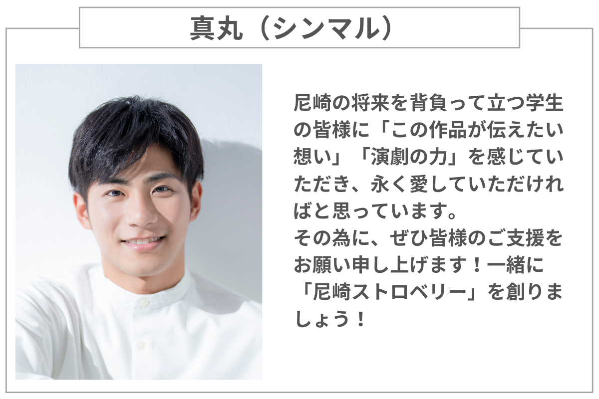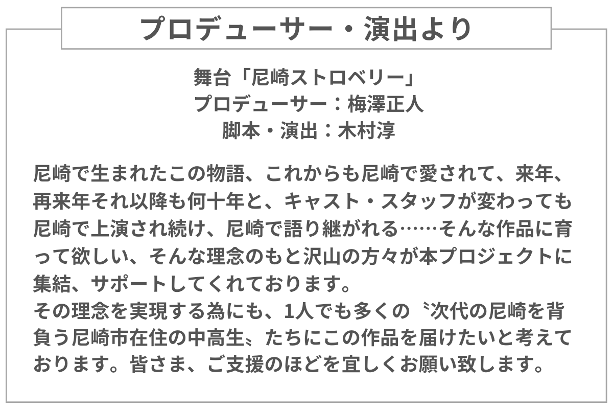 まず、最初にご紹介するのが、本プロジェクトのメインとなるのがこのリターン、尼崎在住中高生550名への舞台「尼崎ストロベリー」観賞ギフトチケットです!