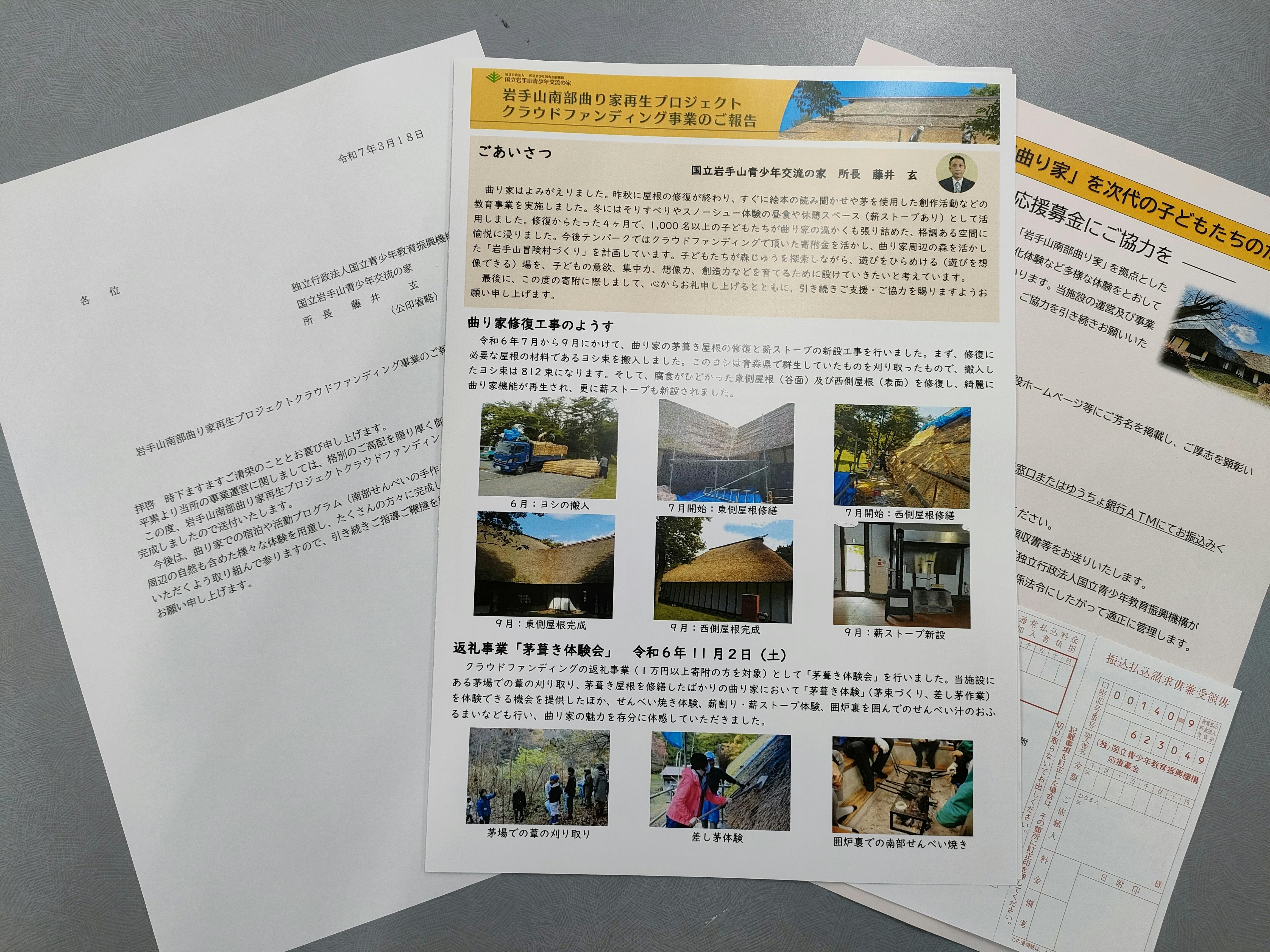 2025/03/25 15:43支援者の皆様へご無沙汰しております。さて、このたびのクラウドファンディング事業のまとめとして事業実施報告書を作成し、先日、5千円以上の寄附者の方々に郵送したところです。おかげさまで無事に茅葺き屋根の修復工事は完成。令和6年11月2日の「茅葺き体験会」でお披露目することができました。皆様のご支援により、曲り家は再生を果たし、すでに1,000人以上の子どもたちが曲り家を利用しています。4月からは曲り家周辺にある豊かな森を活かし、曲り家一帯を「岩手山冒険村」として整備する計画です。すでに専門家のアドバイスをいただきながら、整備計画を立案しているところです。皆様に引き続きご支援とご協力を賜りたく存じます! もっと見る