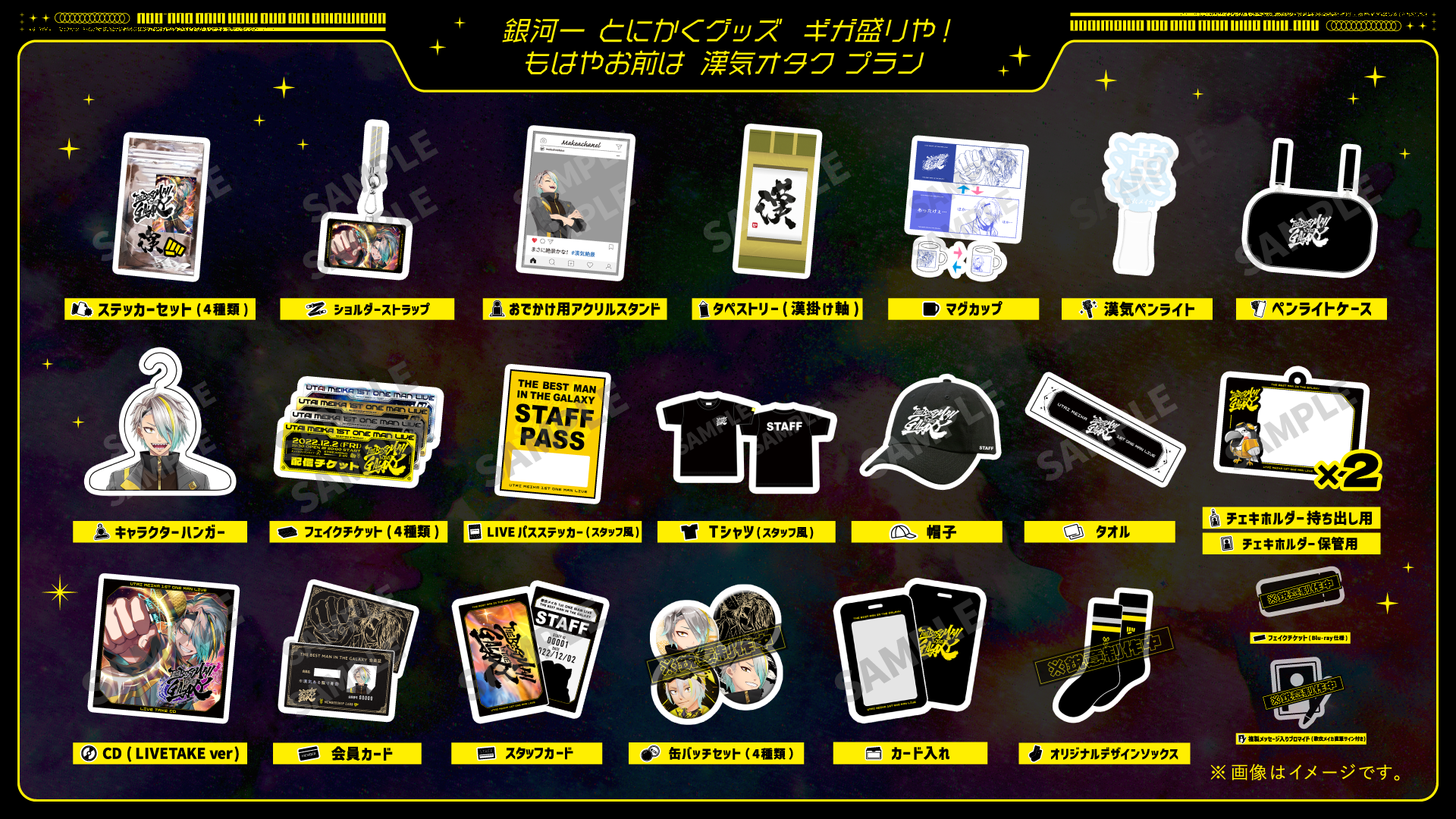 1.Blu-ray/2. フェイクチケット(Blu-ray仕様)/3. ステッカーセット4種類/4. 複製メッセージ入りブロマイド(歌衣メイカ直筆サイン追加!)/5. デジタル壁紙(ループ動画)/6. 会員カード/7. ショルダーストラップ/⒏オリジナル缶バッチ4個セット/⒐デザインソックス/10. お出かけ用アクリルスタンド/11. タペストリー(漢掛け軸)/12. キャラクターハンガー/13. 漢気ペンライト/14. ペンライトケース/15. マグカップ/16. フェイクチケット(4種類)/17. LIVEパスステッカー(スタッフ風)/18. ライブTシャツ(スタッフ風)/19. スタッフカード/20. カード入れ/21. 帽子/22. タオル/23. チェキホルダー(保管用)/24. チェキホルダー(持ち出し用)/25. CD(Live Take .ver)