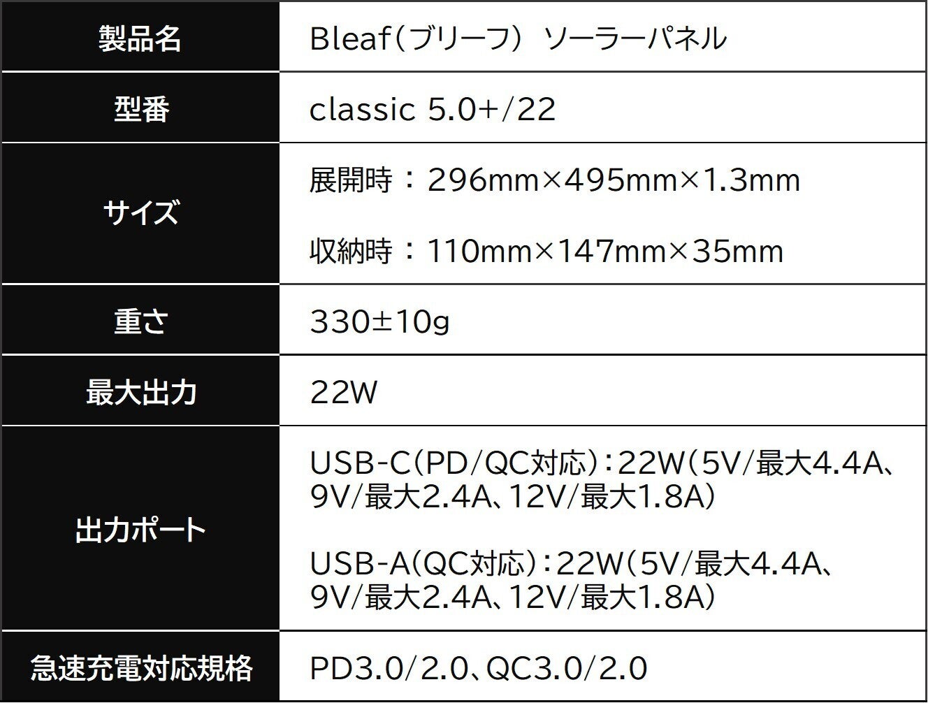 最大出力22W、PD/QCに対応したUSB Type-C、USB-Aポート搭載!ひとつ持っておくと安心のソーラーパネル「Bleaf(ブリーフ)」第3弾、登場です。