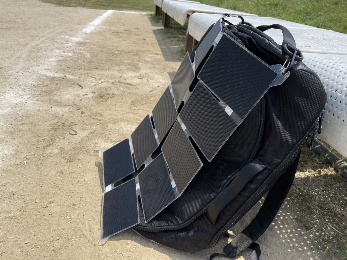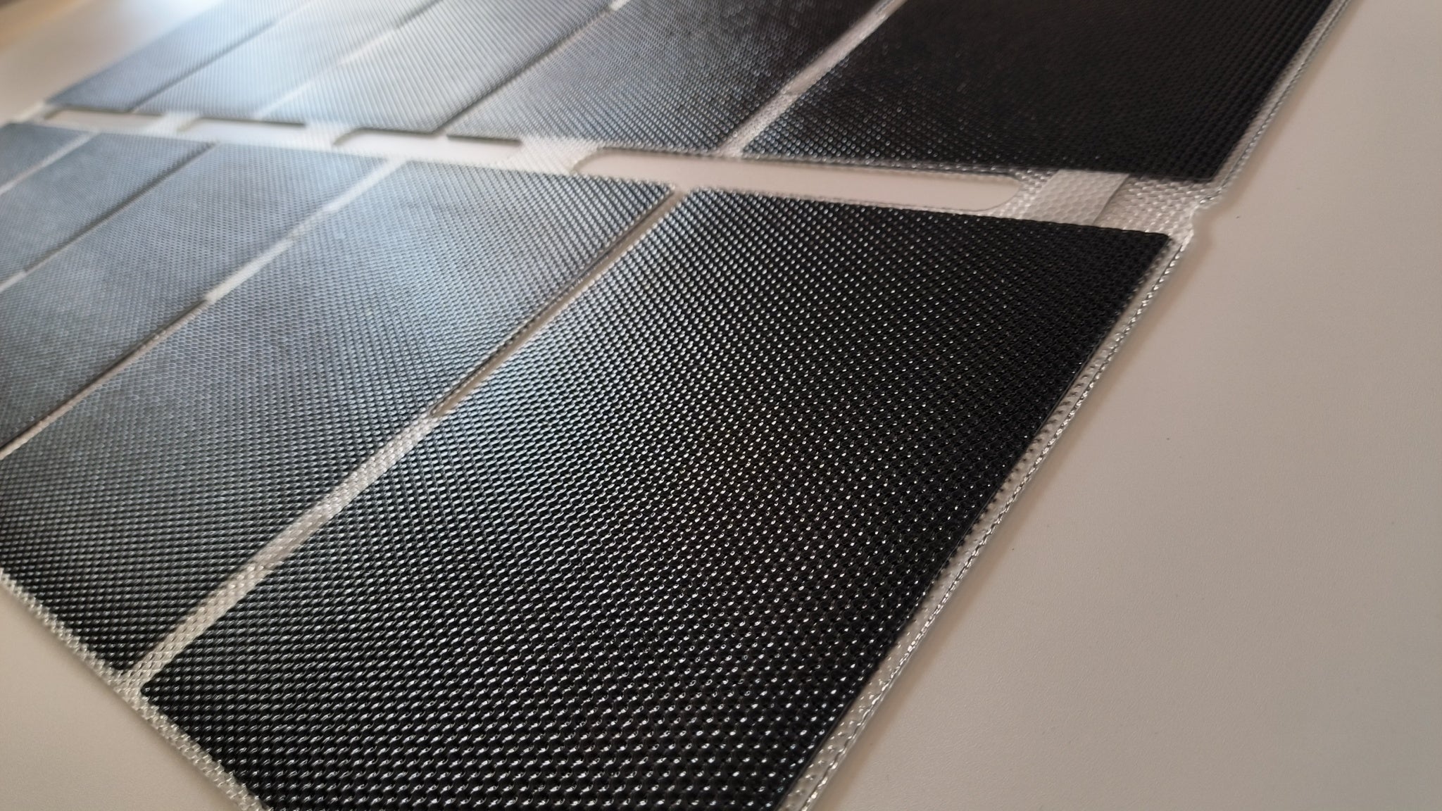 大きい一面のソーラーパネルを切断後、分割された小さいパネルを繰り返しの屈曲に耐える頑丈なフレキシブルフラットケーブル(FFC)で繋げて再構築し、畳んで持ち運べるコンパクト性を実現しました。