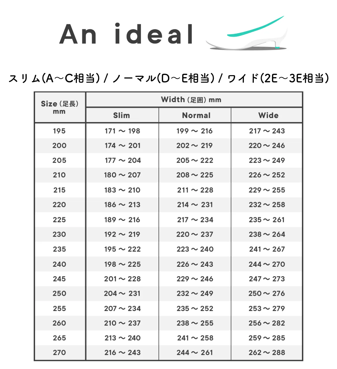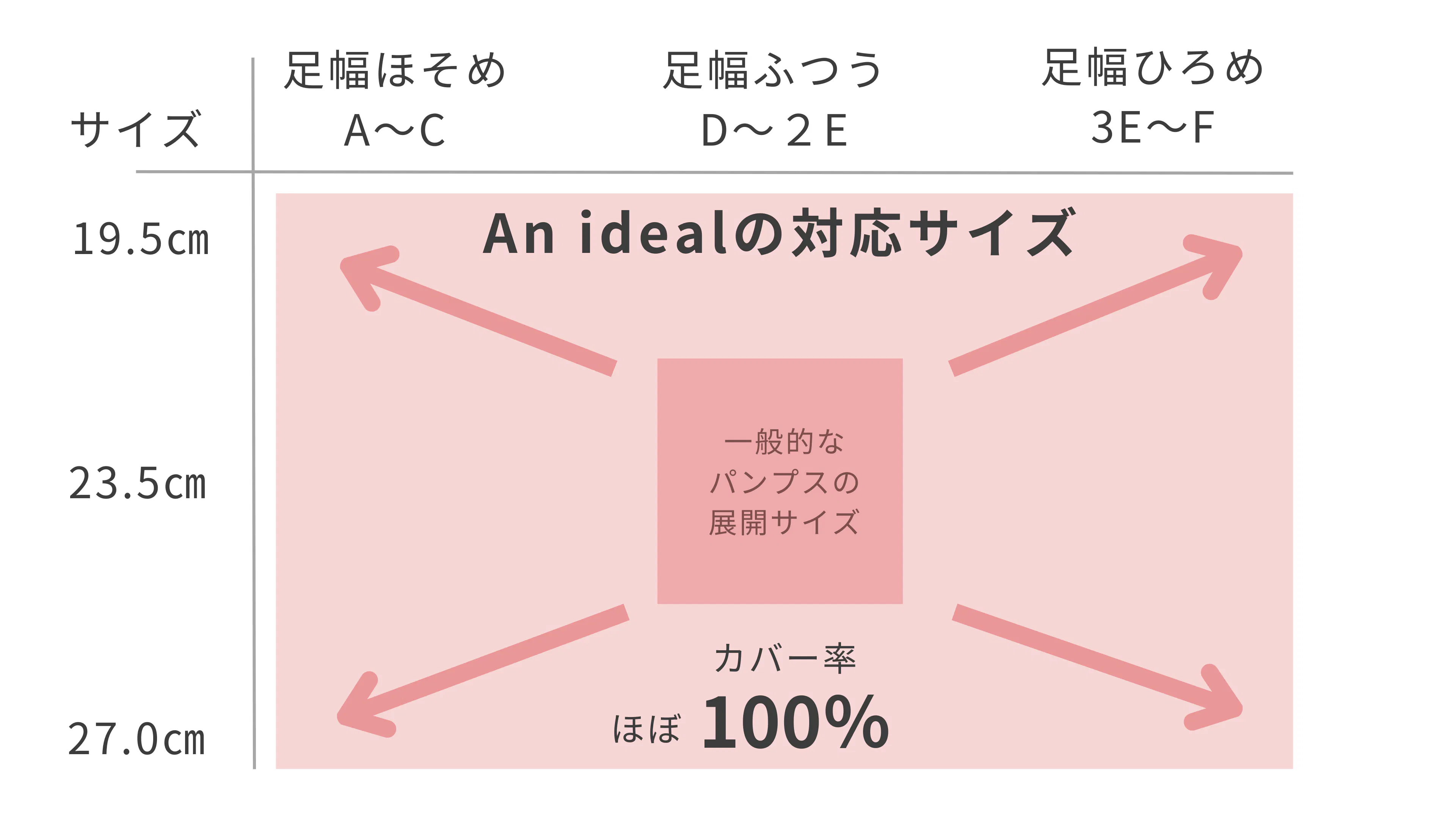 私たちは、「そもそも自分に合うサイズ見つからない。。」「いつも片足だけパカパカしちゃう」などのパンプスのお悩みを解消したい!自分に合うサイズが選べる楽しさをお届けしたい!という思いでAn idealの開発をスタートしました。