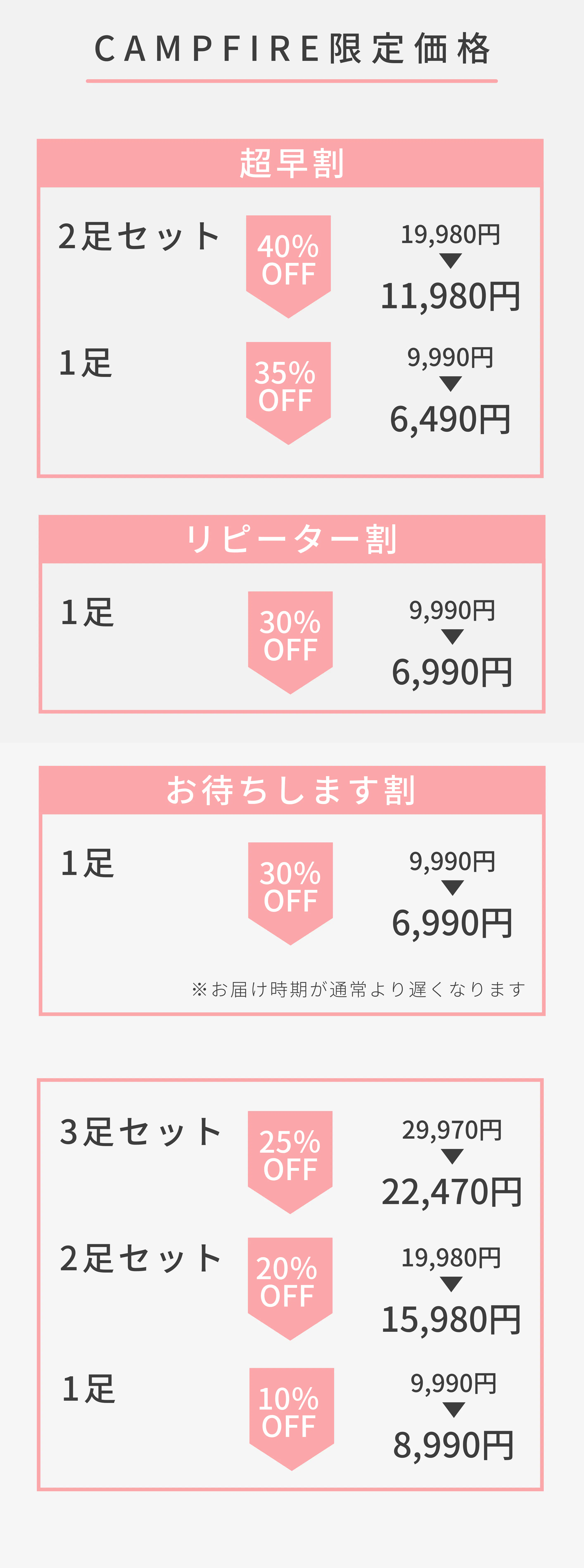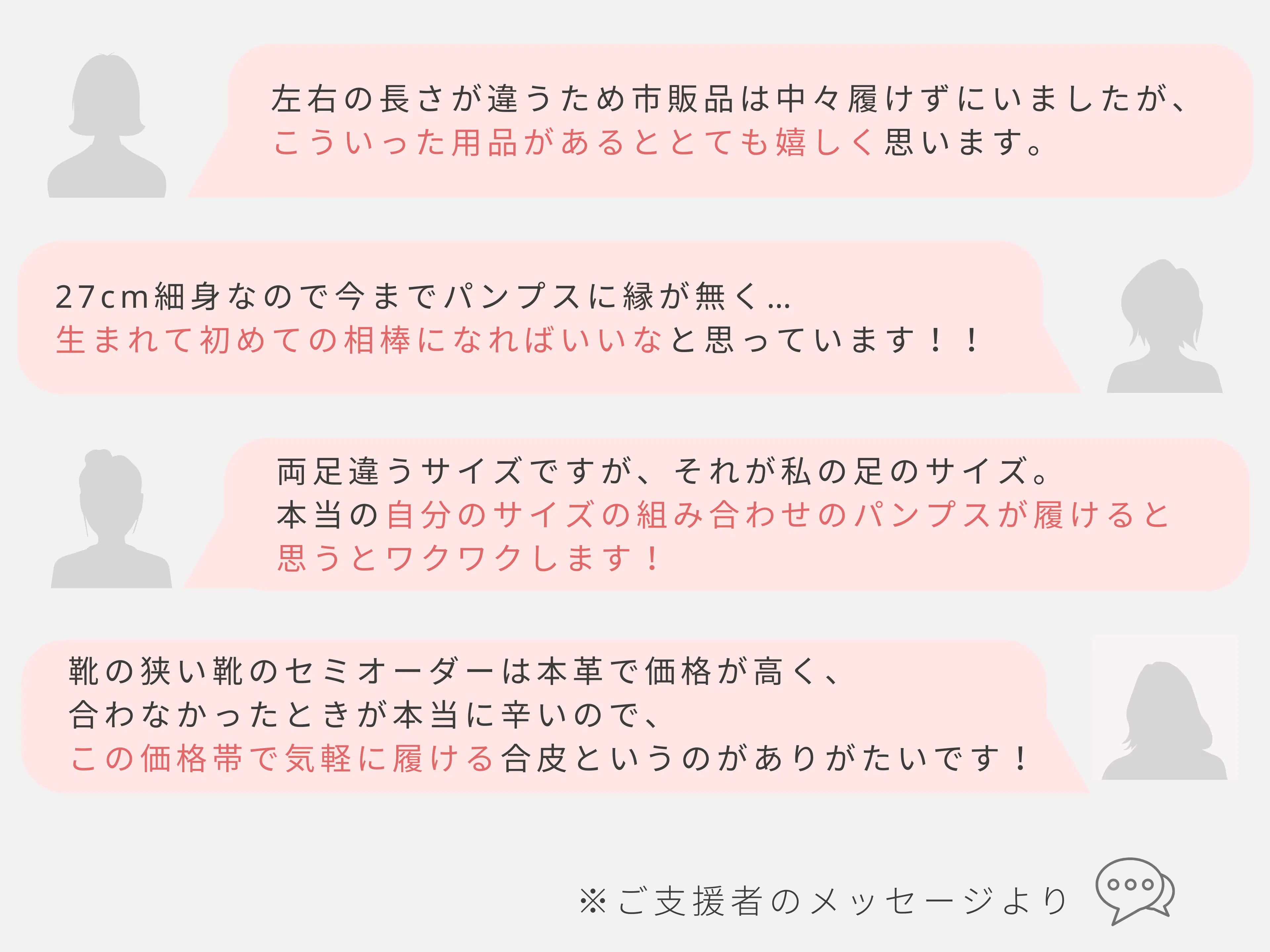 ※2足以上または左右サイズ違いをご支援いただいた方には、お申し込み後、ご希望のカラー・サイズ・幅などについて別途伺いますので、こちらよりメールにて連絡差し上げます。