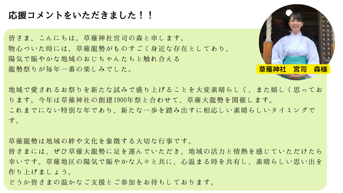 そして創建1900年の記念すべき草薙大龍勢を一緒に盛り上げてください。ぜひ、ご協力お願いします!