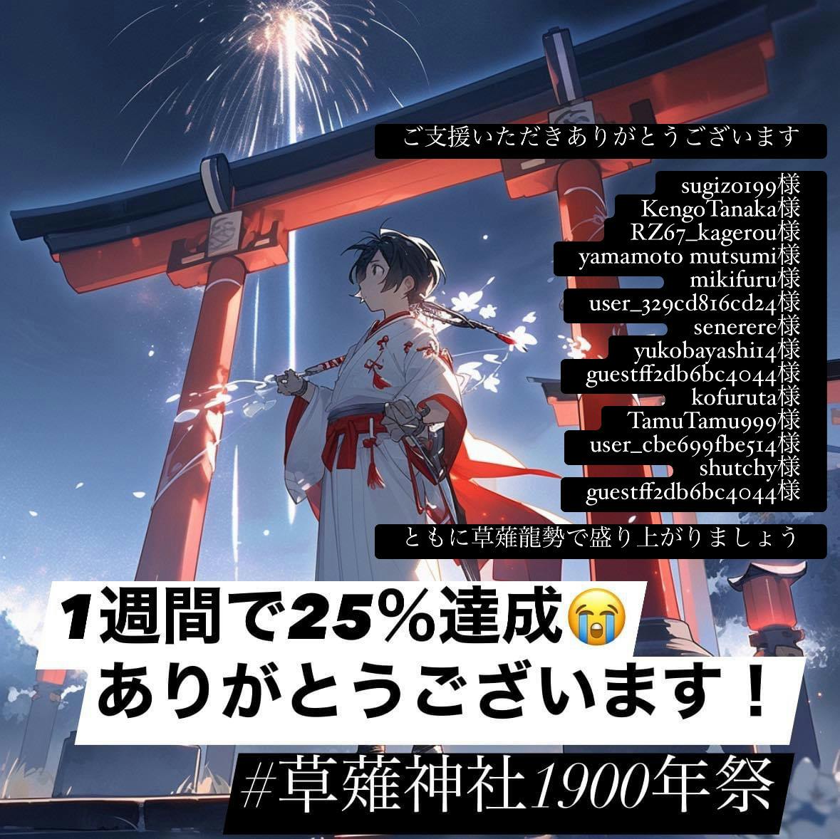 2023/08/18 15:25みなさま、ほんとうにありがとうございます!クラウドファンディングスタート1週間 で目標金額25% 達成です‼この1週間 にどれくらいの人に興味を持って頂けたかというと、"1250名"の方に商店会のクラウドファンディングwebページを訪れていただきその中からはやくも 14人 ものご支援をいただきました!各種SNSのviewに至っては 総計1万view を超えました(汗)草薙商店会始まって以来の出来事ですもう一度、改めて言わせていただきます!皆様、このプロジェクトの拡散やご支援をいただきほんとうに!ありがとうございます♪↓↓↓↓↓まだまだ多くの皆さまと一緒に #草薙龍勢 を盛り上げていければと思ってます#目標は100人の皆様と『草薙商店会の龍勢で盛り上がりたい!』どうぞ引き続き、ご協力よろしくお願いします=====✳︎ご支援いただき ありがとうございます✳︎sugizo199様KengoTanaka様RZ67_kagerou様yamamoto mutsumi様mikifuru様user_329cd816cd24様senerere様yukobayashi14様guestff2db6bc4044様kofuruta様TamuTamu999様user_cbe699fbe514様shutchy様guestff2db6bc4044様14名の皆様。ともに草薙龍勢で盛り上がりましょう‼ もっと見る
