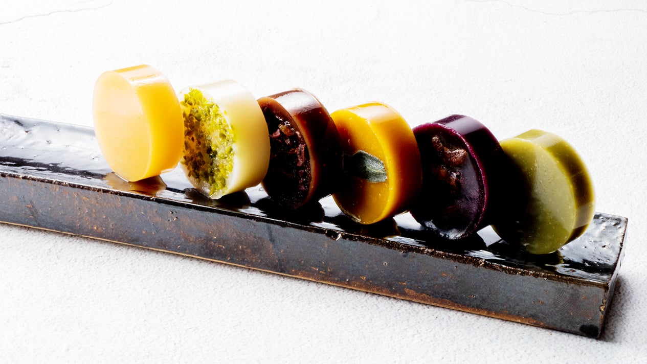 羊羹は、自然の色味を大切にし、素材の色のみで無添加です。甘さも控えめで、砂糖も沖縄の黒糖や奄美諸島のザラメなどを使用、和菓子の起源ともいわれる素材の木の実や果物と、スパイスやドライフルーツ、ナッツ、味噌、酒粕などがアクセントになるので、ワインやお酒とのペアリングも楽しめます。