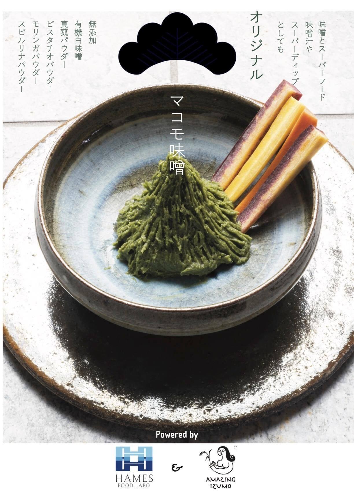神事に使用される神聖な真菰を、ピスタチオとスーパーフードを加えた味噌と練り合わせ、あんに仕上げた、抹茶のような不思議な味わいがする一品です。真菰の深い味わいと、ピスタチオの香ばしさが絶妙にマッチし、スーパーフードの栄養価も加わって、体にも嬉しい一品です。