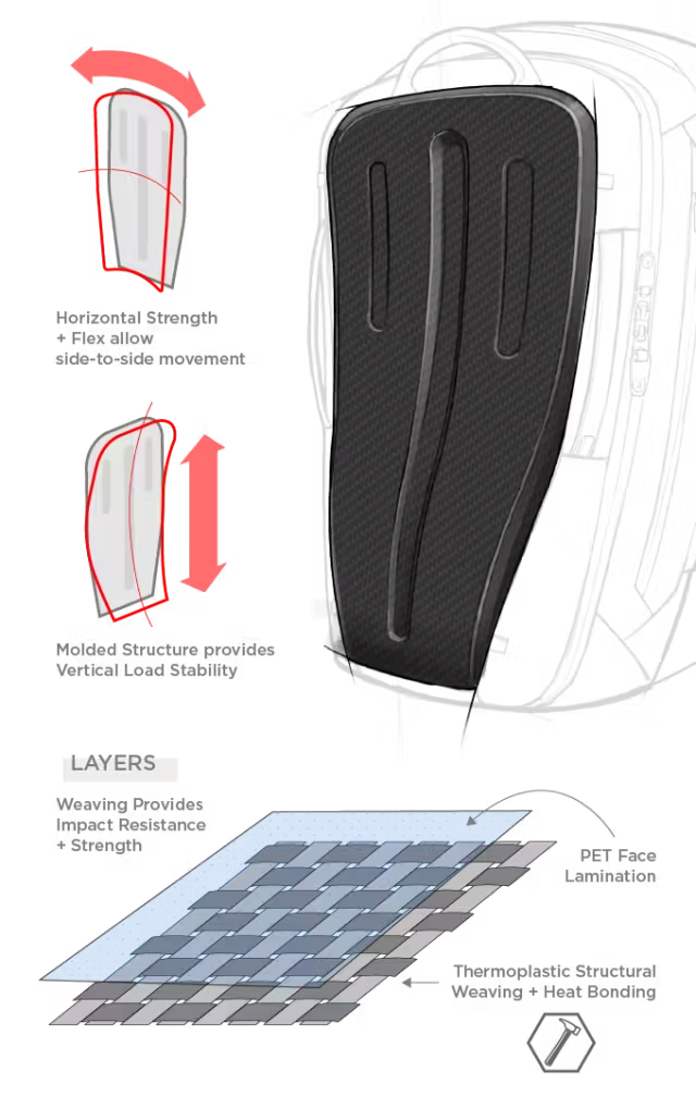 誰でも背負いやすい、ドイツで設計されたCURV複合フレームシートの背面パネル人間工学に基づいてドイツで設計された、誰でも背負いやすい背面フレーム。背中のカーブにフィットしており、長時間の移動も快適です。
