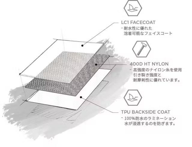 メイン生地は、耐摩耗・耐引裂性に優れた400Dハイテナシティーナイロン。表地には撥水加工のLC1 FACECOATを、裏地には水の侵入を防ぐTPUをラミネートしています。