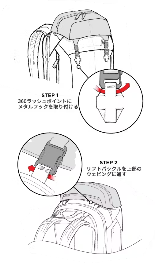 ラッシュストラップを利用すれば、モジュラーコンポーネントなどの追加アイテムをパックの外側に固定できます。