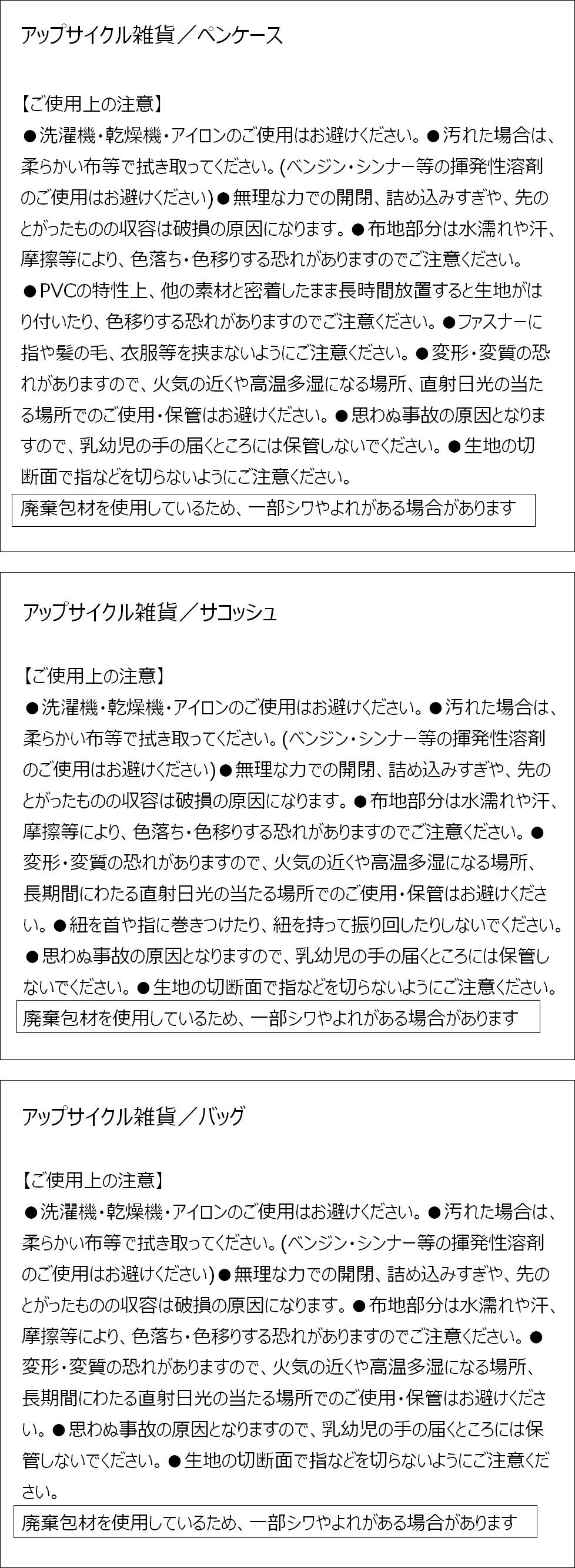 ●廃棄包材を使ったアップサイクル商品のため、シワやよれがゼロでありません。商品になれなかった廃棄包材を救おうという主旨をご理解頂きご参加ください。