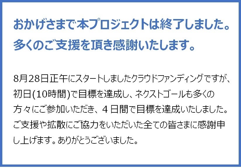 2023年8月28日(月) 12:00 クラウドファンディングスタート2023年10月13日(金) 23:59 クラウドファンディング終了