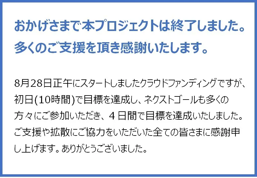 2023年10月11日(水) 23:59 クラウドファンディング終了