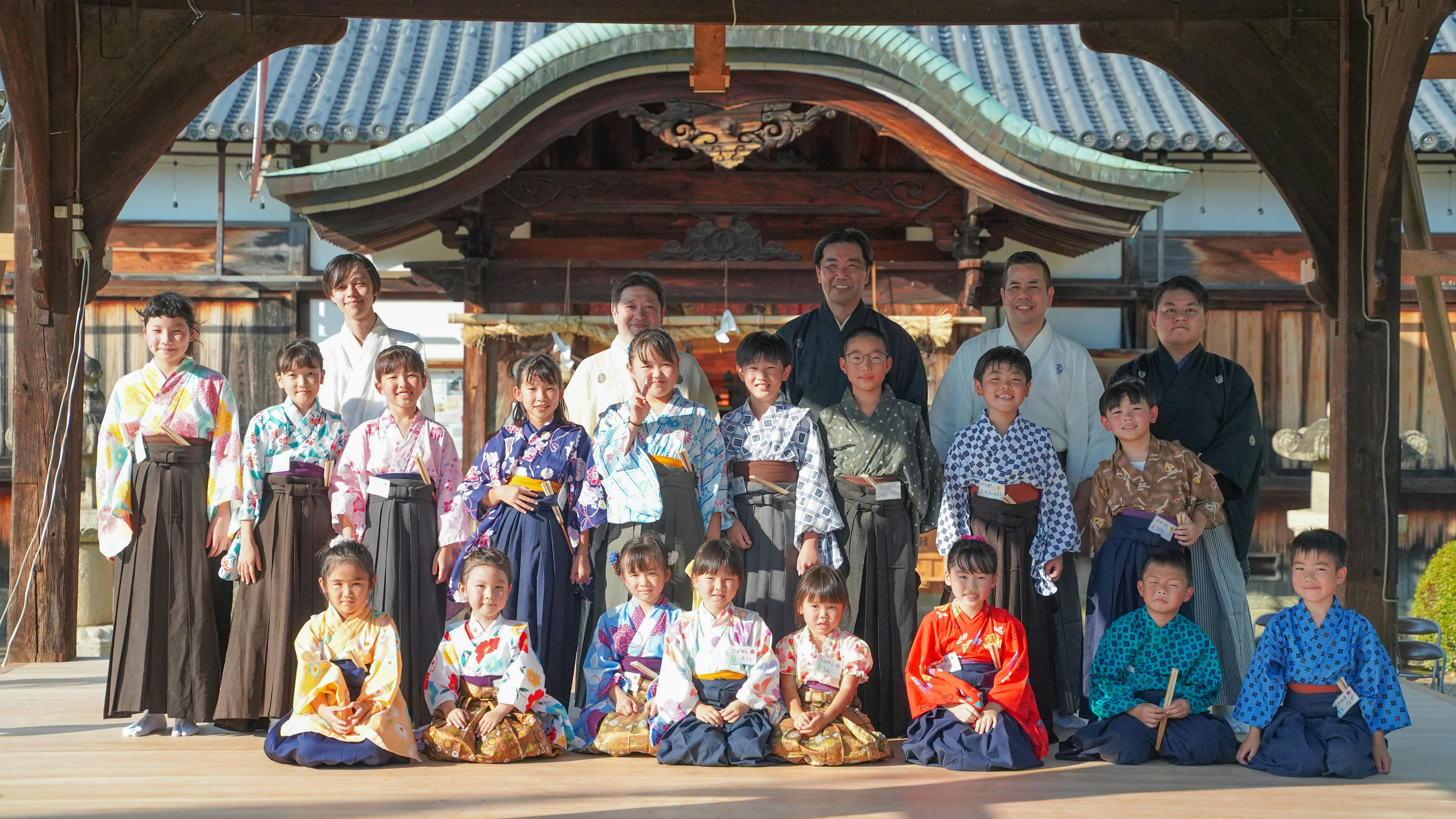 実行委員会が復活させた「能の蟻通神社」を次世代に伝承していくために、昨年の夏休みから「子ども能楽体験教室」をスタートさせました。今年は19名の小中学生の参加をいただき、最終回には袴をつけた凜々しい姿で舞殿での発表会を行いました。