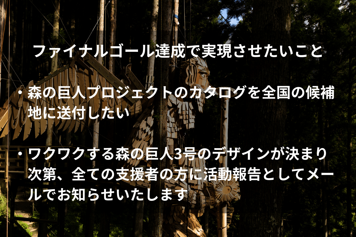 このプロジェクトでは、現在2体の森の巨人が完成しているので3体目を作るための建設費をご支援いただきたいと思っています。森の巨人3号は徳島県三好市、または愛媛県西条市を候補地(共に自社で管理している山林)にしています。