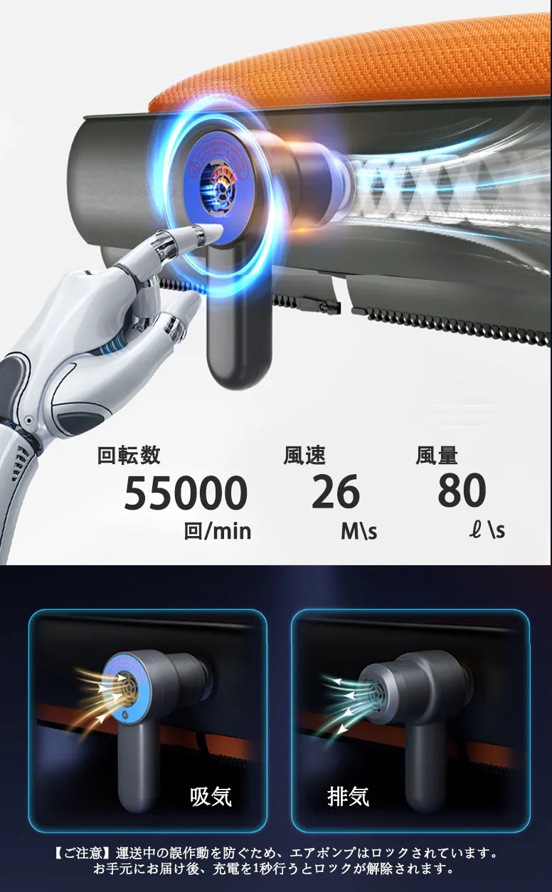 (1)このマットレスには、ワイヤレス空気入れ・空気抜きが両方できるポンプが付属しています。このポンプは、毎分55,000回転、秒速26メートルの風速、毎分80リットルの風量を誇ります。充電可能で、Type-Cの高速充電に対応しています。