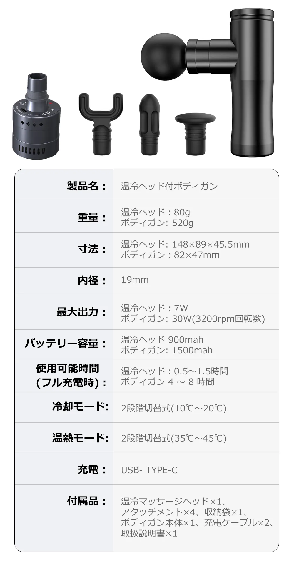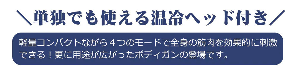 さらに温冷機能のついたヘッドを組み合わせることで、日常やトレーニングの後に効果的にご利用いただける新たな価値を提供できるボディガンとなりました。